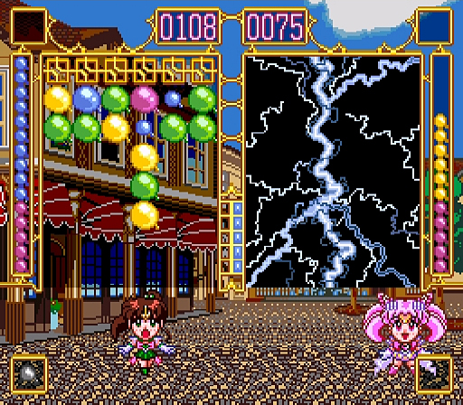 Żeby móc zobaczyć wszystkie ważniejsze ułożenia, w trakcie gry należy wcisnąć Select, wtedy w miejscu gdzie jest pole przeciwnika wyświetlone zostaną owe kombinacje. Pozostałe ułożenia 4 balonów raczej nie są dobre, gdyż wypada z nich „pożeracz energii”, tj. gdy go zbierzemy, nasza moc, którą reprezentują kolorowe kulki z lewej strony (lub prawej w Stars), spada do zera. Wtedy, w wersji SS, nasza Wojowniczka przemienia się z powrotem w „wersję cywilną” i może zbijać balony tylko pojedynczo. W Stars nie ma już tak poważnych konsekwencji, tracimy tylko energię. Co do punktów mocy, zdobywamy je za każdy strącony balon (tracimy natomiast za szare, lecz także tylko w SS). Można ją wykorzystywać, aby wezwać Tuxedo lub uzbierać do końca, wtedy istnieje możliwość przeprowadzenia ataku magicznego. W Stars uaktywnia się on automatycznie, co czasem jest irytujące, gdyż chciałoby się zachować go na później. Co do samej gry, jeszcze, wraz z upływem czasu „sufit”, do którego przyczepiają się balony, z czasem się obniża utrudniając nam zadanie, w wersji Stars tej opcji także nie ma, gdyż same zaklęcie przeciwników wystarczająco utrudniają rozgrywkę. Jeśli chodzi o ataki magiczne, w SS są one bardziej urozmaicone dla każdej Wojowniczki, natomiast w Stars zazwyczaj mają podobną do siebie formę, tj. całe pole przeciwnika zapełnia się mieszanką szarych (lub nie napompowanych) balonów z kolorowymi, choć zdarzają się odstępstwa od reguły. Może wymienię kilka takich w SS, jak np. odebranie przeciwnikowi punktów mocy lub dodanie do jego balonów rządu szarych, i sporo podobnych, ale żeby nie psuć niespodzianki oraz pozostawić pewną motywację, nie będę ich tu bliżej opisywał. No chyba że na specjalne żądanie. 😛